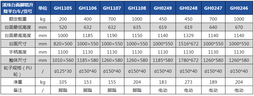 冠航牌滾珠式腳踏/電動(dòng)升降平臺(tái)貨物搬運(yùn)車(chē)